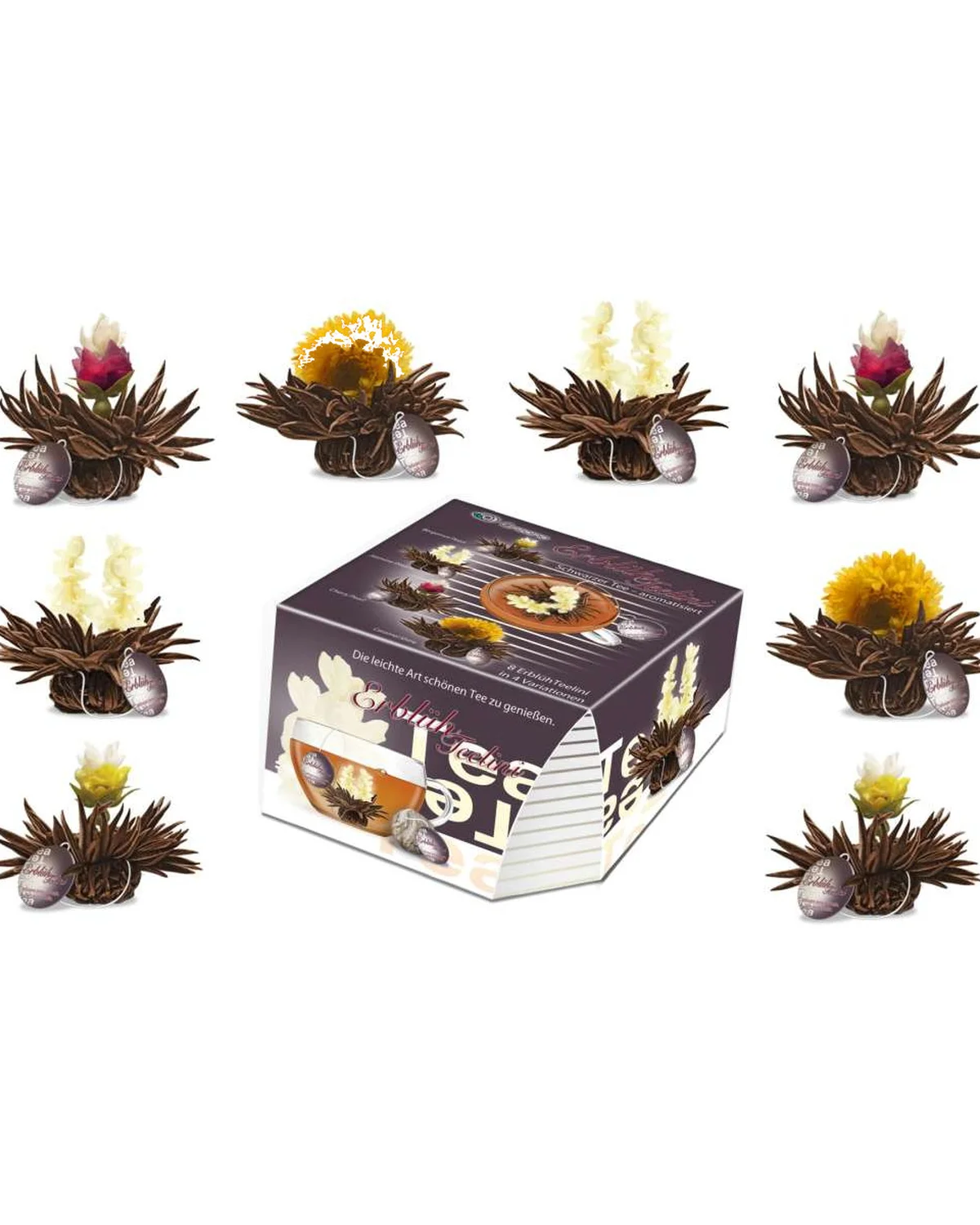 Deze zwarte theeblomenen set bevat 4 verschillende soorten theebloemen op basis van zwarte thee. De eerste smaak is Jasmine Dream en is een combinatie met jasmijnbloesem en jasmijn smaak. De tweede thee is Cherry Pearl en is zwarte thee met roos, jasmijnbloesem en kersensmaak. Caramel Shine is een wat zoetere zwarte thee met goudsbloem- en karamelsmaak. De theeset wordt afgesloten met Bergamot Pearl, wat een combinatie is van zwarte thee met roos, jasmijnbloemen en bergamotsmaak.