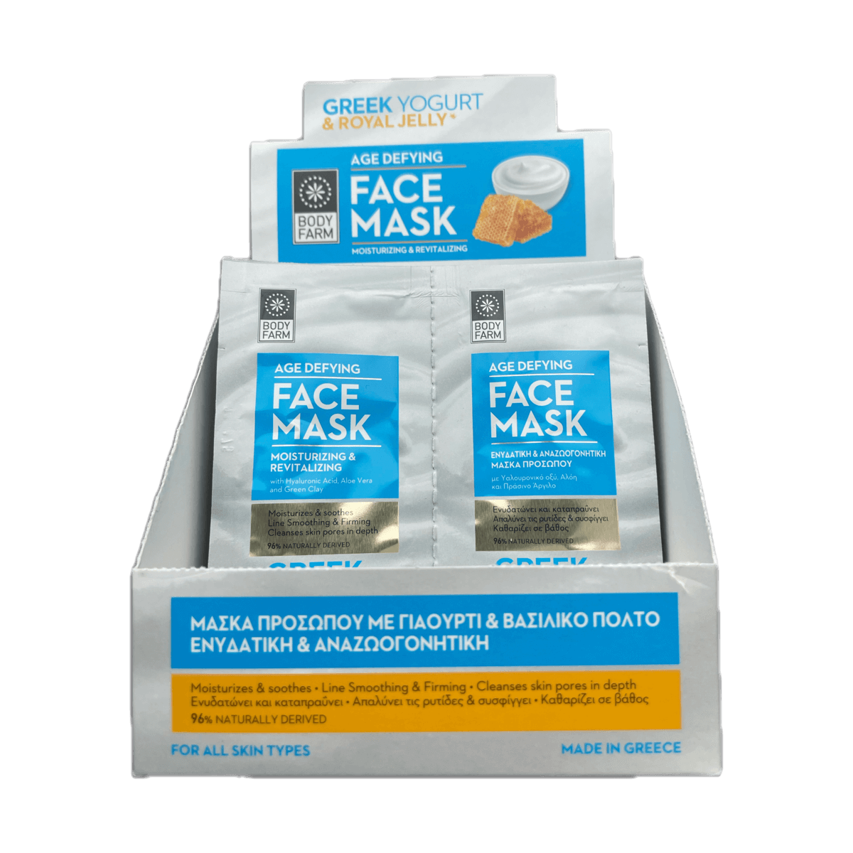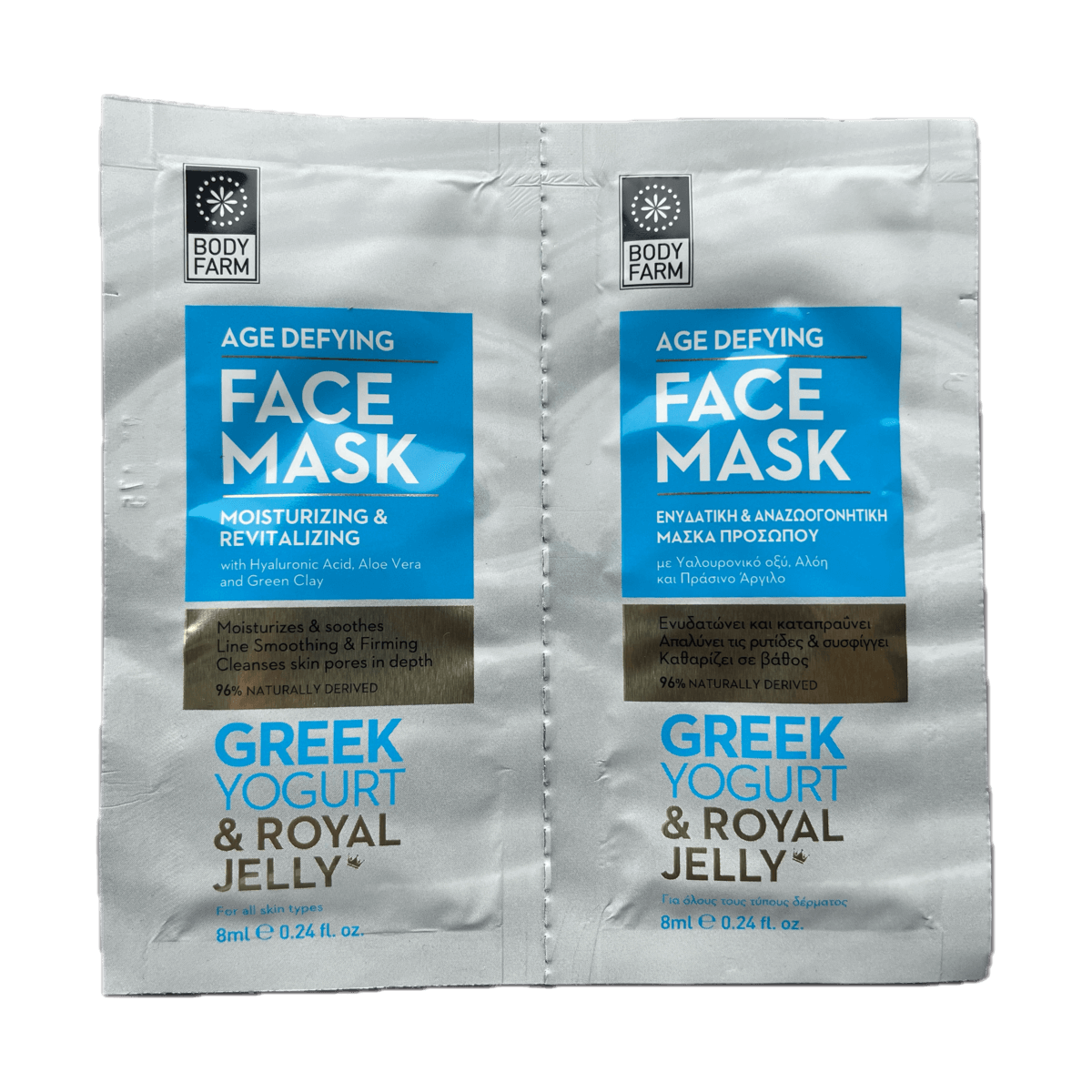 Griekse yoghurt heeft veel voordelen en wordt daarom in ons gezichtsmasker verwerkt. De actieve ingrediënten van yoghurt, koninginnengelei en hyaluronzuur verhogen het vochtgehalte in de bovenste lagen van de huid en zorgen voor een antirimpeleffect. Daarnaast versnelt het de celvernieuwing en herstelt de balans van het microbioom, wat je huid aanzienlijk verbeterd.