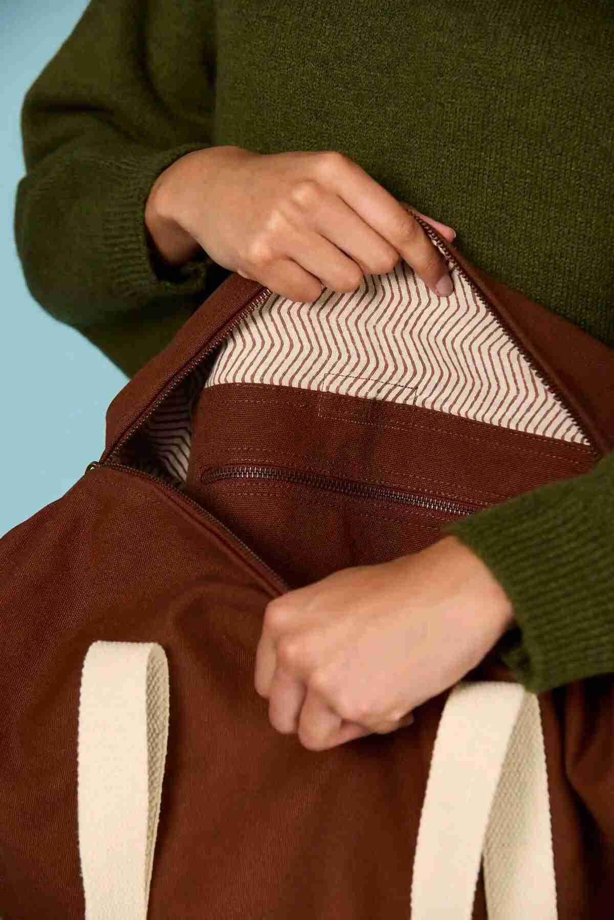 De tas, dubbele handvat en verstelbare schouder riem zijn handgemaakt van super-bestendig biologisch GOTS katoen.