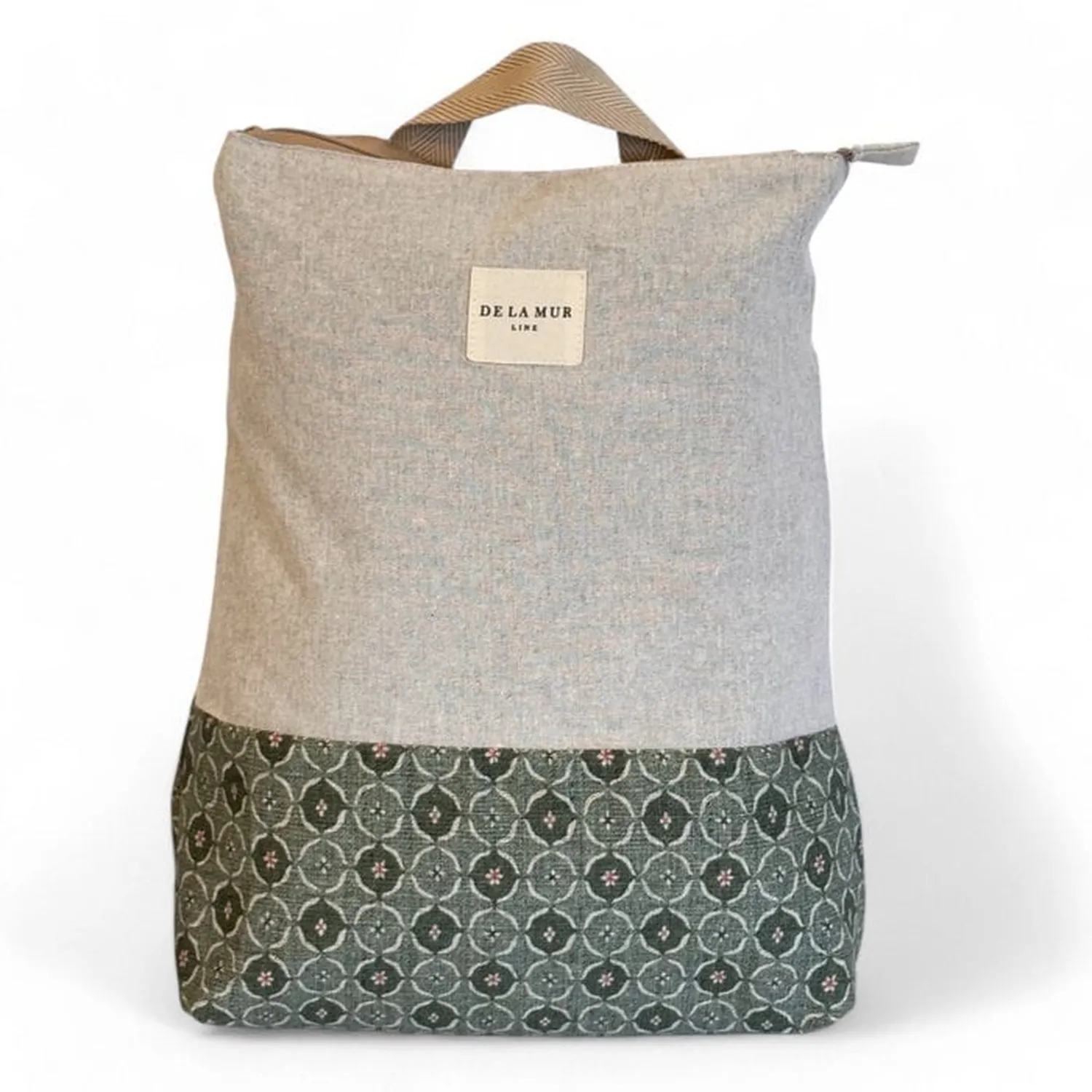 De rugzak is gemaakt van twee hoogwaardige stoffen: een stevige beige meubelstof aan de bovenzijde en een kleurrijke jacquard blokprint aan de onderzijde. Deze combinatie zorgt voor een verfijnde en speelse uitstraling.
