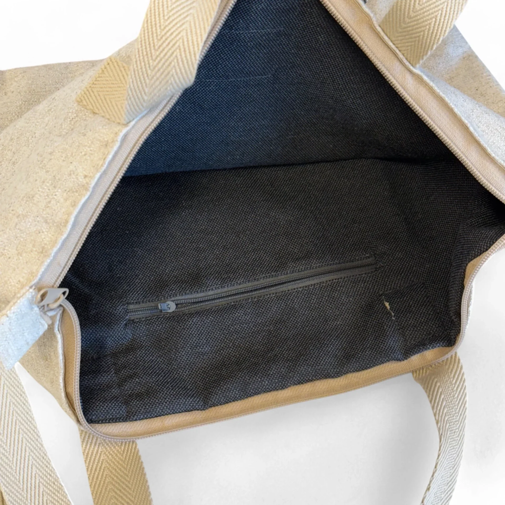 De gevoerde tas heeft twee stevige en verstelbare schouderbanden en wordt aan de bovenkant afgesloten middels een stevige rits. Daarnaast bevat de tas een handvat waardoor jij hem op verschillende manieren kan dragen. Het extra binnenzak zorgt ervoor dat je je spullen handig op kan bergen. Wat deze stoffen rugtas bijzonder maakt, is de combinatie van twee hoogwaardige stoffen: een stevige beige meubelstof aan de bovenkant en een rijke jacquard stof aan de onderzijde. De onderzijde heeft een kleurrijk blokpatroon op een zachte grijze achtergrond. Deze mix geeft de tas een verfijnde, maar speelse uitstraling.