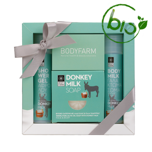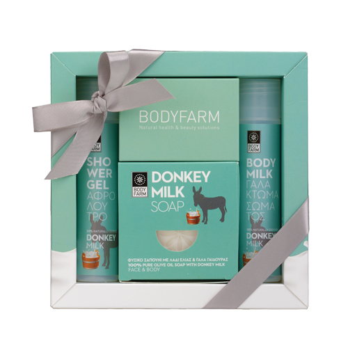 Deze leuke driedelige luxe cadeau set Donkey milk bevat zowel de douchegel, bodylotion en zeep van Donkey milk.